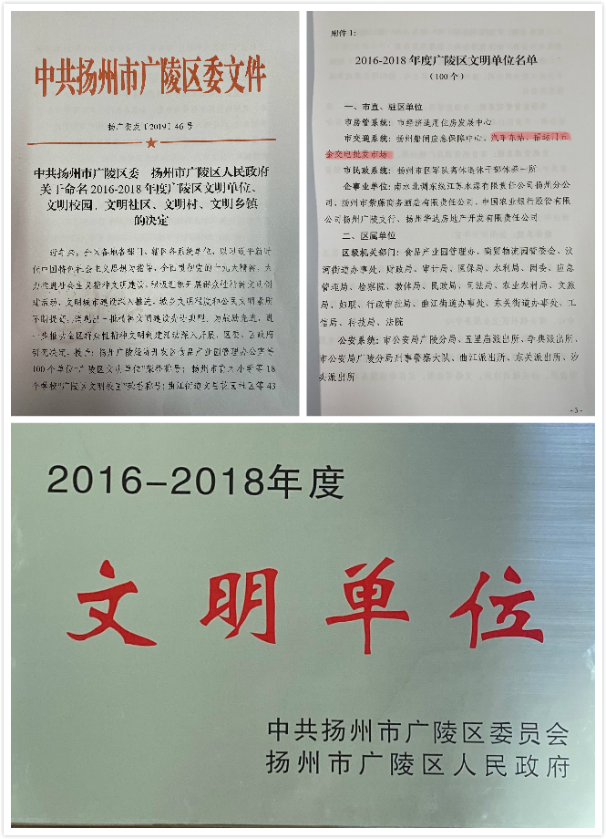 東站、五金市場(chǎng)獲2016--2018年度廣陵區(qū)“文明單位”榮譽(yù)稱(chēng)號(hào)