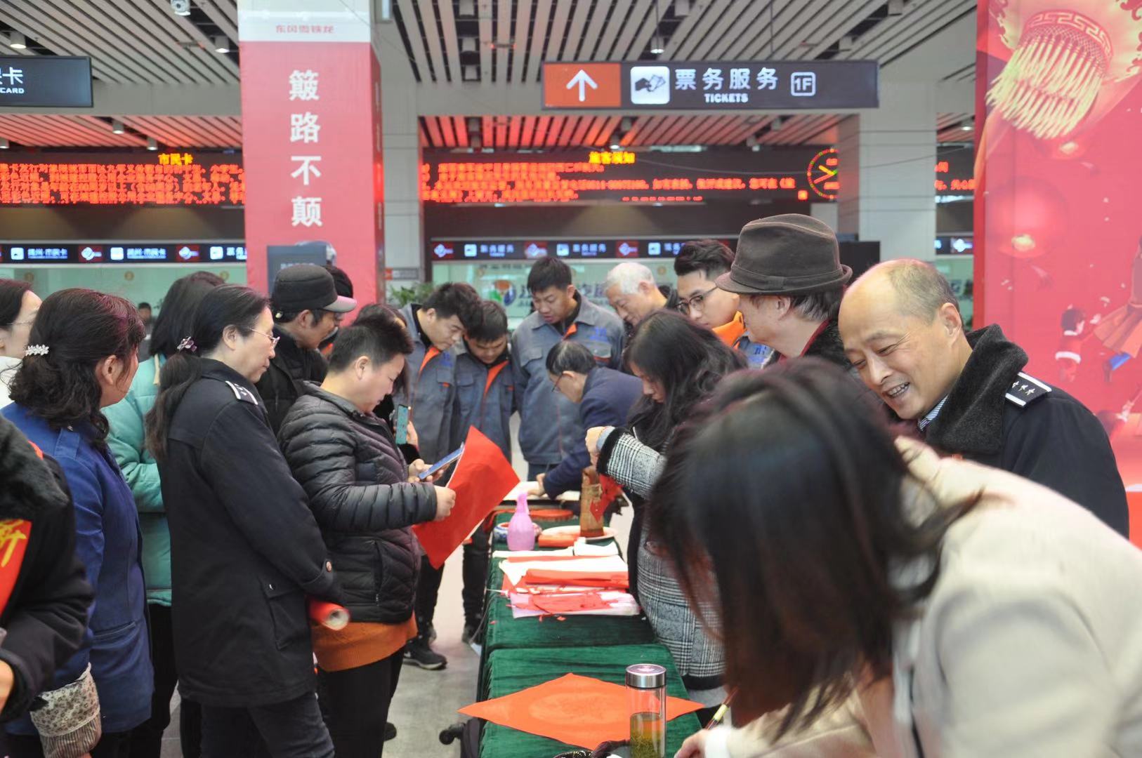活動現(xiàn)場,揚州市書法協(xié)會、剪紙協(xié)會、揚州汽車站的志愿者和旅客們進(jìn)行了書法、剪紙創(chuàng)作送祝福的互動,在這寒冷的冬季,為歸鄉(xiāng)的旅客送去溫馨的祝福,讓旅客“溫暖相伴·幸;丶”。